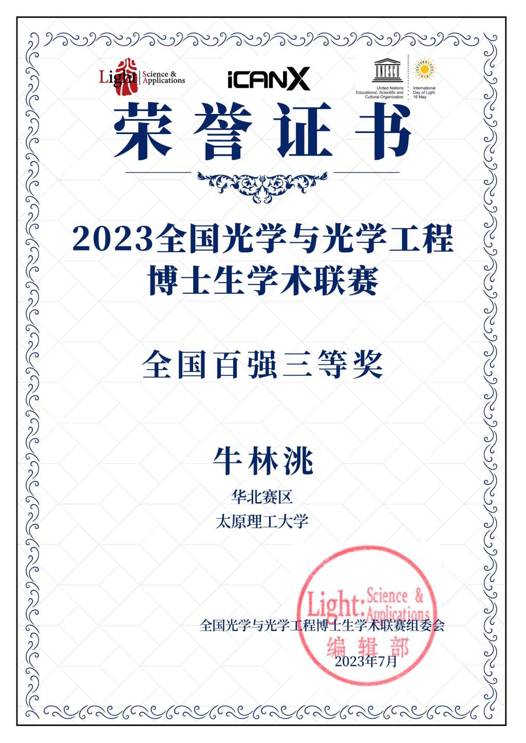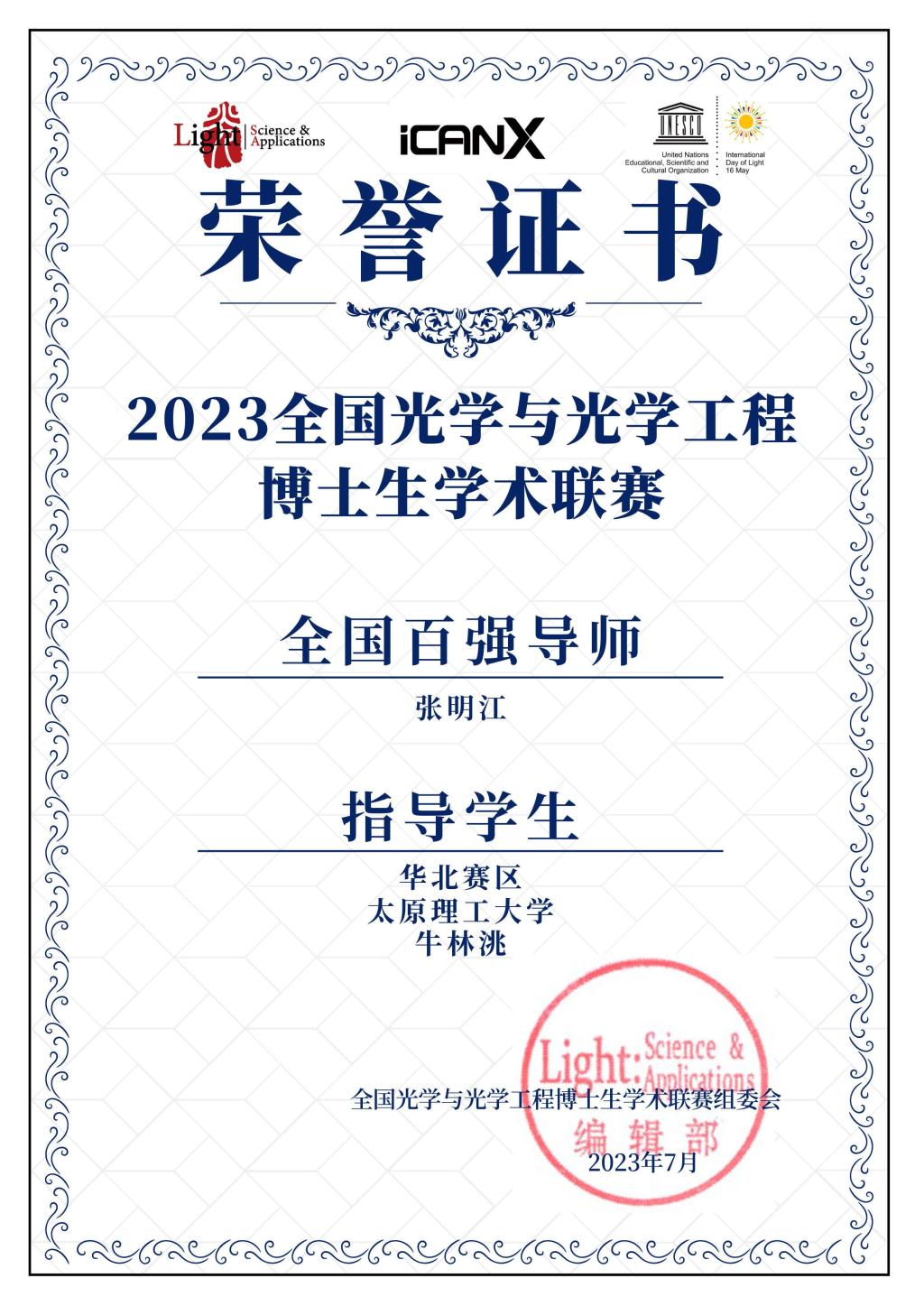 2023年7月16日,我院张明江教授指导的博士生牛林洮在2023年全国光学与光学工程博士生学术联赛获全国百强三等奖,张明江教授获全国百强优秀导师称号。