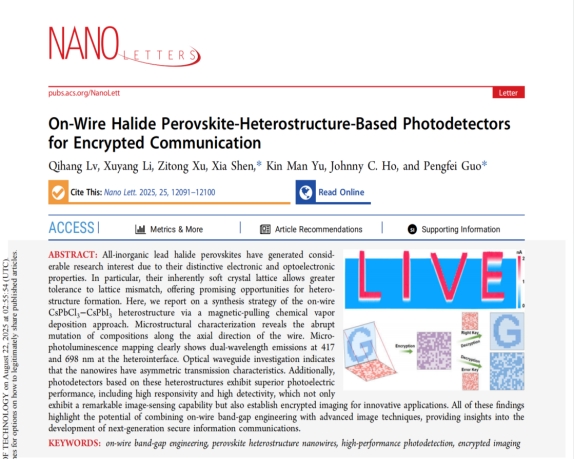 近日,我院郭鹏飞课题组在纳米光子学研究领域取得系列重要研究进展,研究成果以“On-Wire Halide Perovskite-Heterostructure-Based Photodetectors for Encrypted Communication”及“Ultrafast Nanoimaging of Carrier Funneling in Composition-Graded Semiconductor Nanowires”为题,分别发表在国际顶级学术期刊 Nano Letters(IF:9.9)及ACS Nano(IF:16.1)。我院郭鹏飞副研究员,沈霞博士,美国加州大学伯克利分校Costas P. Grigoropoulos教授及美国普度大学Jingang Li博士为论文通讯作者。研究工作获得国家自然科学基金资助。