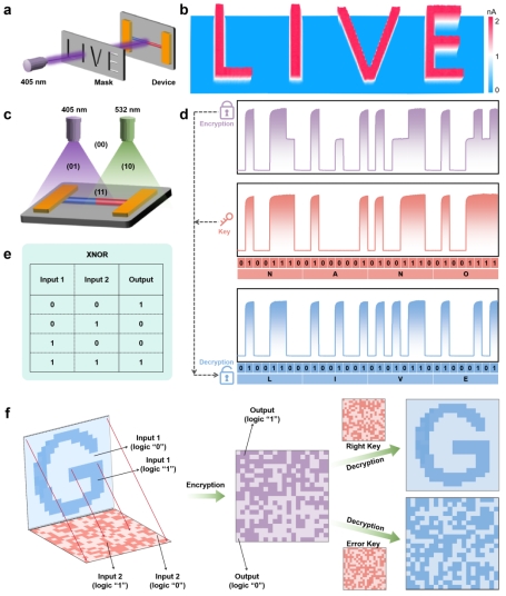 近年来,基于人工微结构设计的纳米光子学研究成为研究的热点话题。高性能的光电探测器在广泛应用的同时也对光电器件提出了更高的需求,例如小型化,可集成化及多功能化。在微纳尺度上通过合理的结构设计及组分调制技术不仅极大程度提高了载流子迁移率,并且对器件的吸收及发射特性进行调控,为新一代高性能集成光电器件的发展奠定了基础。论文基于钙钛矿异质结构纳米线的高性能光电探测器开展深入研究,并应用于光学成像及光加密通信领域,研究结果如图三所示,为基于高性能光电探测器的高分辨率空间图像“LIVE”与双通道光加密通信应用研究。该研究工作为研究钙钛矿异质结构中载流子的传输特性提供了材料平台,在新一代高性能集成光子器件中具有潜在的应用价值。同时,以激光作为光信号和数据信息媒介,大幅提升信息的保密性和安全性,对推动光子通信及信息全光处理等领域的发展具有重要意义。