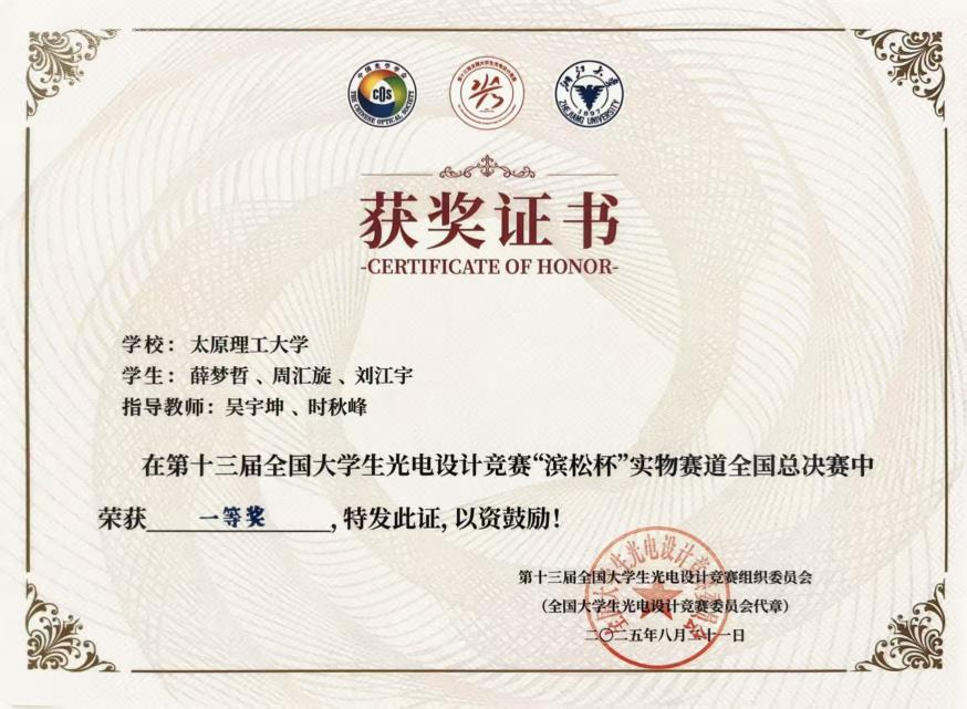 2025年8月22日,第十三届全国大学生光电设计竞赛决赛在浙江大学紫金港校区落下帷幕。来自304永利集团的“越测越精”队——薛梦哲、刘江宇、周汇旋和团队指导老师——吴宇坤、时秋峰,凭借其出色的创新设计与稳定的临场发挥,从众多顶尖队伍中脱颖而出,一举夺得全国一等奖的骄人成绩