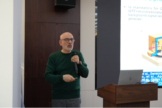 Vincenzo Spagnolo教授是国际光学工程学会(SPIE)会士和美国光学学会(OSA)的高级会员,2019年被美国斯坦福大学评选为全球前2%的科学家,2023年起,他被列入工程与技术学科的全球顶尖科学家名单,是2014至2023年期间在“光声光谱”、“气体探测器”和“甲烷”主题词中全球最具生产力作者。他在报告中详细描述了基于定制石英音叉在OEPAS和LITES传感领域的成果,重点关注其实际应用,详细介绍了一种创新的鞋盒尺寸QEPAS传感器系统。