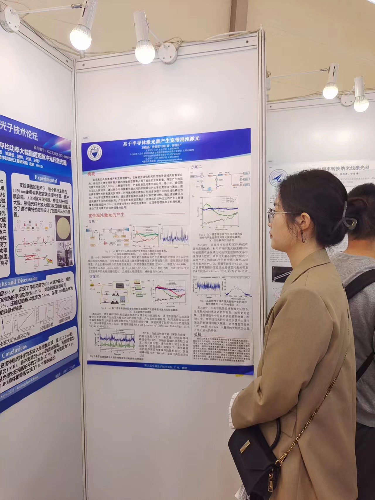 博士研究生柴萌萌、卫晓晶、王婷玉、刘双双、刘慧、牛林洮,硕士研究生陈靖分别展示了题为《波长可调谐单片集成混沌半导体激光器》、《基于半导体激光器产生宽带混沌激光》、《基于3×3耦合器相位解调的分布式声传感样机研制》、《基于积分变换提取布里渊频移的BOTDR样机研制》、《长距离高空间分辨率混沌布里渊传感技术》、《相位型混沌激光布里渊光相关域分析技术》、《多斜坡辅助型混沌布里渊动态应变传感技术》的学术海报。同学们在向业内同行展示自己科研成果的同时,极大地拓宽了学术视野,为更好地开展科学研究工作提供了助力。
