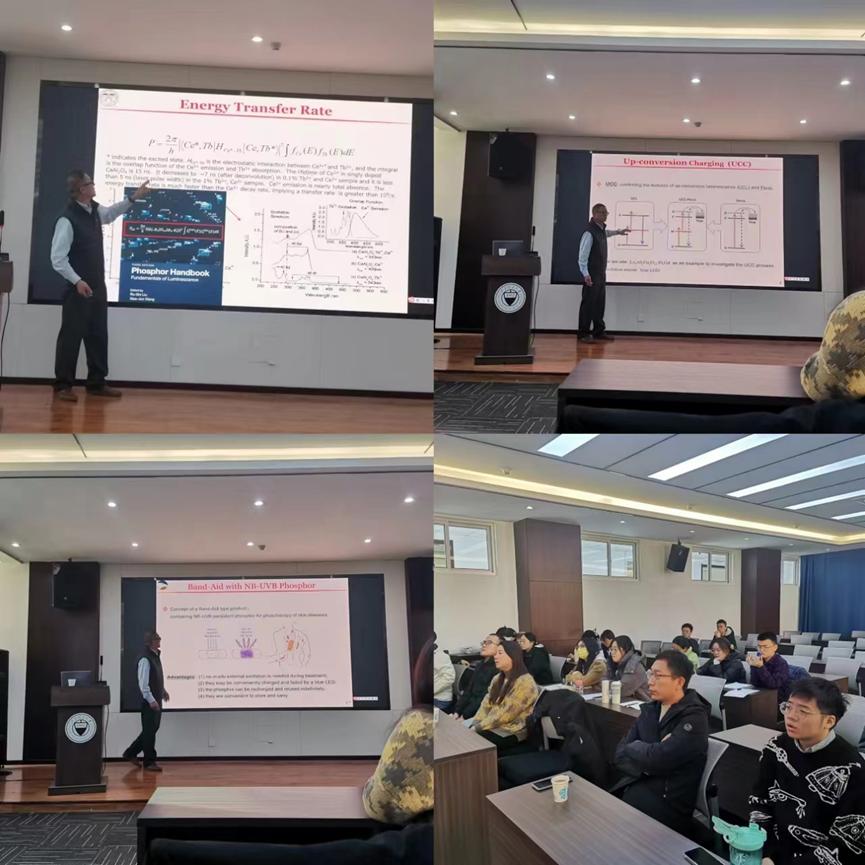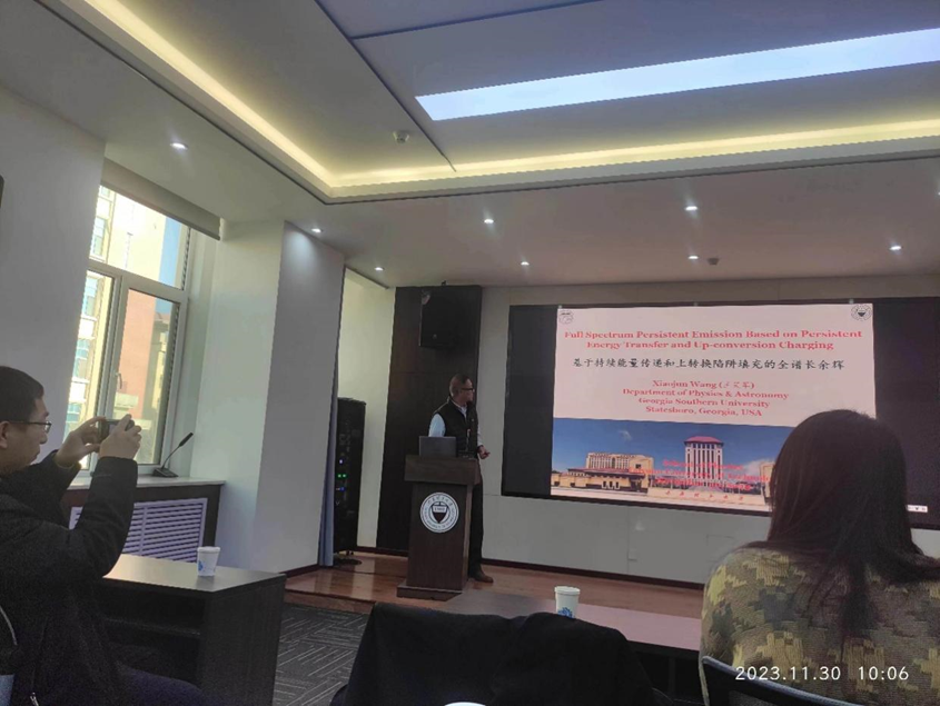 2023年11月30日上午,为了解研究领域前沿现状,激发学术热情,启迪研究思路,稀土发光课题组特邀美国南佐治亚大学王笑军教授在物理楼304会议室给课题组团队展开基于持续能量传递和上转换陷阱填充的全谱长余辉为主题的学术报告。